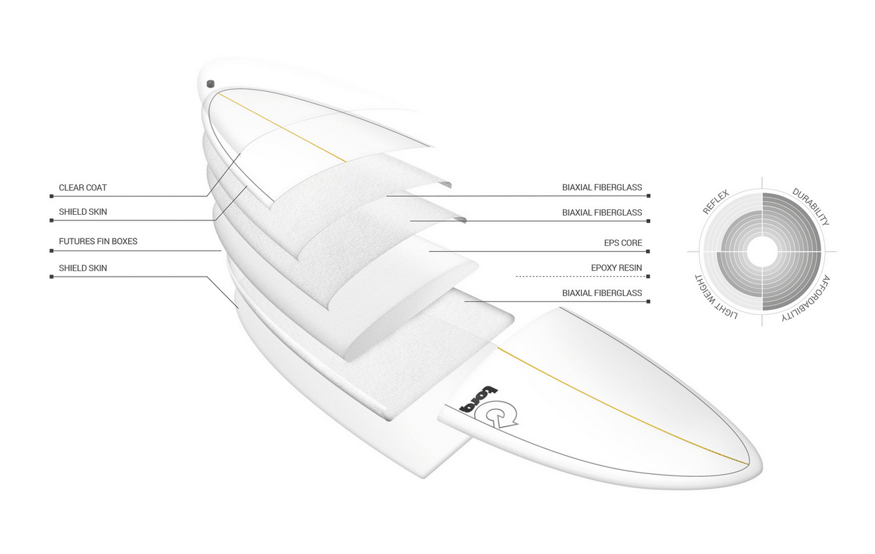 Il composito epossidico Torq offre forme performanti grazie alla nostra laminazione epossidica sottovuoto. La laminazione epossidica sottovuoto utilizza un processo di laminazione manuale, con un processo di incollaggio sottovuoto per legare le fibre alla tavola e rimuovere la resina in eccesso. Abbiamo adottato alcuni accorgimenti nel processo sottovuoto che mantengono il contenuto di resina a un livello molto più elevato di quanto si possa ottenere normalmente.