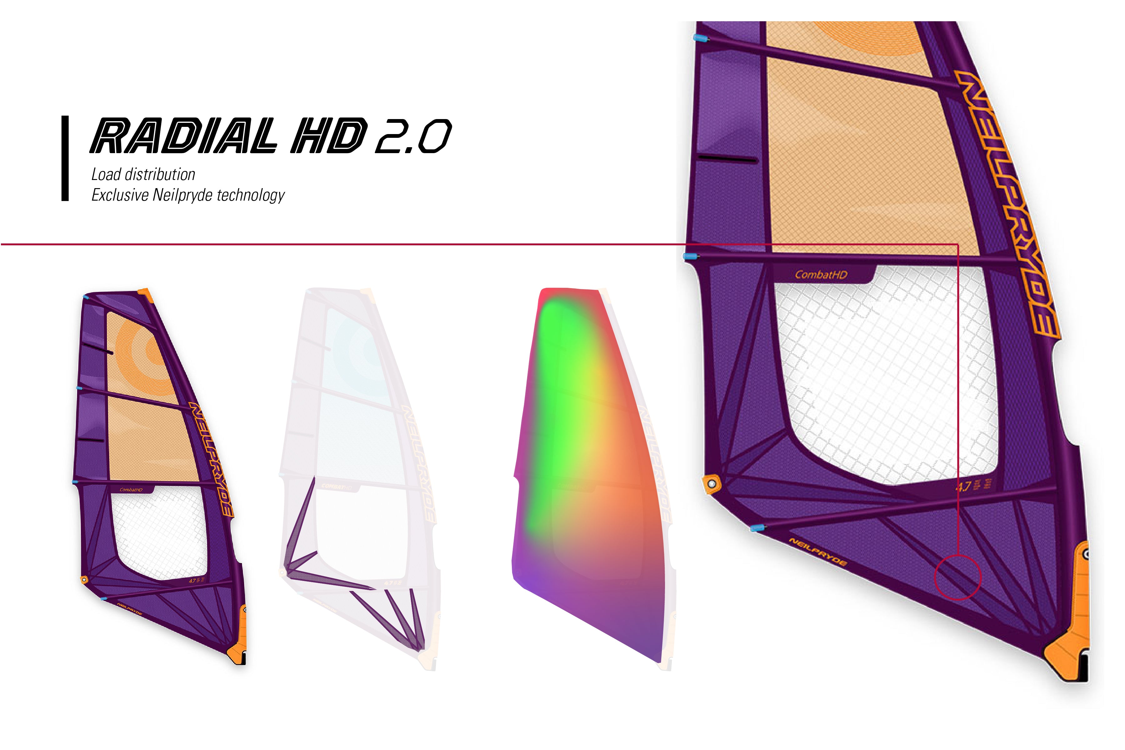 Radial HD panels are stitched together, creating our strong- est radial panels at our most affordable price point. This construction allows us to provide maximum strength in the highest load areas and minimum weight towards the centre of the sail where such strong material is not necessary.